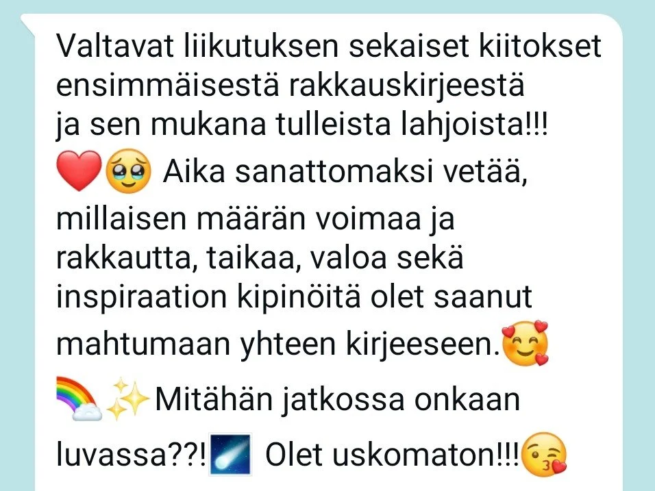 Jos vastasit 'kyllä' johonkin näistä, uskon syvästi, että rakkauskirjeillä on voimaa lisätä elämääsi hyvää. Olisi aivan ihanaa jakaa niitä kanssasi! ❤️