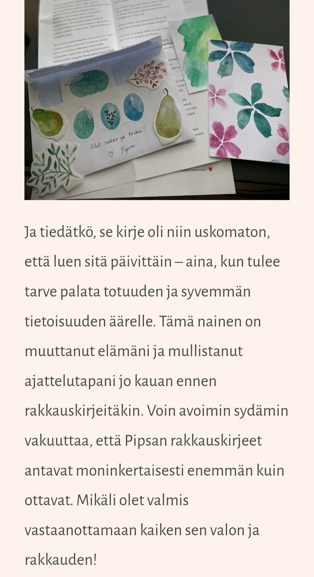 “Voin avoimin sydämin vakuuttaa, että Pipsan rakkauskirjeet antavat moninkertaisesti enemmän kuin ottavat. Mikäli olet valmis vastaanottamaan kaiken sen valon ja rakkauden!”